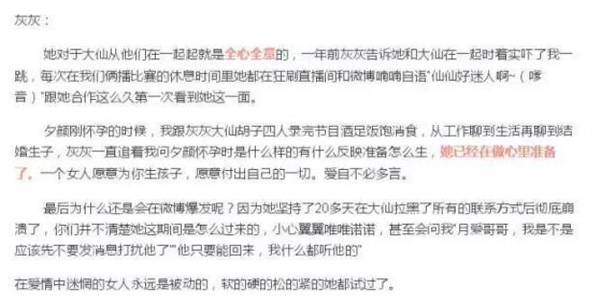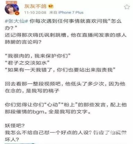 不过据小编的了解两人分手后都曾经各执一词表示是对方的错,灰灰甚至在网上直接把张大仙的黑料给曝光在了网上,当然真实性雄辩也没办法肯定,毕竟两人处于撕逼状态灰黑也是很正常的,那么灰灰到底说了些什么呢?