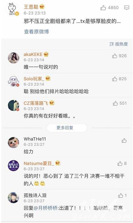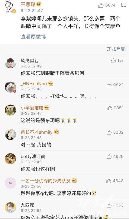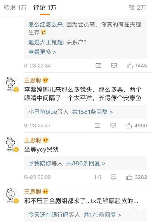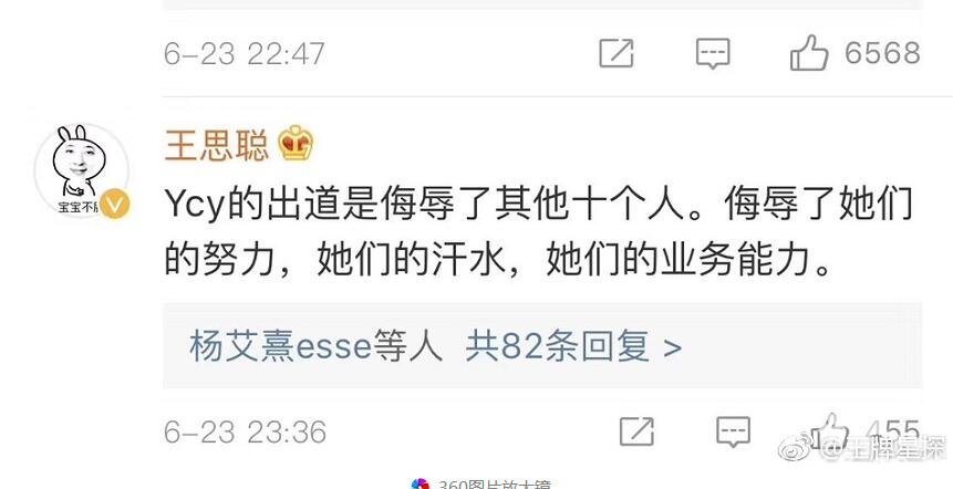 而号称娱乐圈纪委的“王思聪”也开口了不过王思聪可不仅仅是喷杨超越而已接连喷了多位出道选手例如李子璇:“李紫婷长得像个安康鱼哪来那么多镜头,两个眼睛中间隔了一个太平洋。”还有yamy和sunnee杨芸晴;“有yamy和sunnee杨芸晴不如叫男团得了”以及坐等杨超越哭戏。