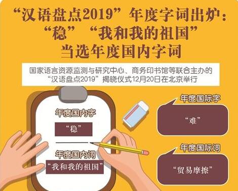 国家语言资源监测与研究中心、商务印书馆等联合主办的“汉语盘点2019”揭晓仪式20日在京举行。“稳”“我和我的祖国”“难”“贸易摩擦”分别当选年度国内字、国内词、国际字、国际词。