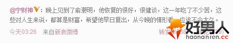 为此记者联系了俞灏明的助理司捷,他惊诧于宁财神发微博一事,表示并不知情。对于俞灏明康复近况,他透露俞灏明一直还在恢复,“他还在休息,到目前为止仍然没有复出的计划”,然后便匆匆挂断了记者的电话。