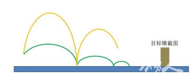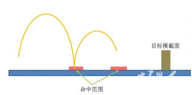先看第一幅图,我们定义两种弹道,一种比较平直,一种仰角很大。并在图上描绘地方命中区域的面积(这里做一个修正,因为榴弹初速度一样,高仰角的榴弹比低仰角落地后反弹更少的次数爆炸)