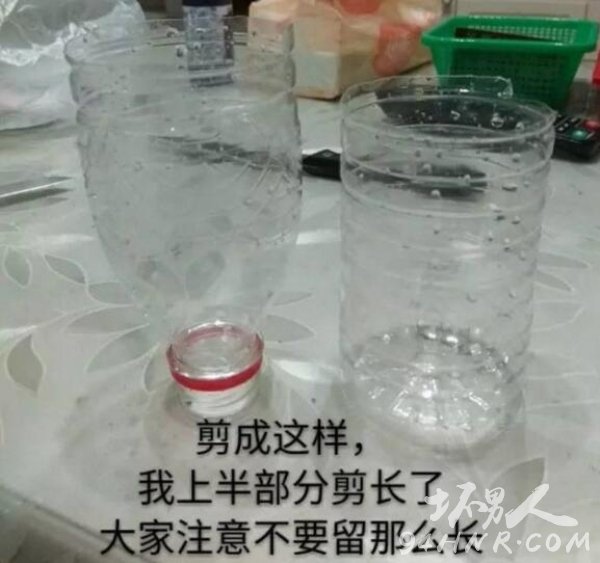 然后我们将瓶子如同图中一样,拦腰剪成两段,这里要注意的是,剪出来的上半部要比下半部短那么一丢丢,小编这里把上半部剪长了,等会还得修剪一番。