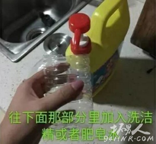 接着我们拿出刚才剪出来的瓶子的下半部,往里加入一点洗洁精或者是肥皂水,因为在蟑螂的腹部 会分泌出一种油脂,可以帮助蟑螂在垂直的墙面上爬行,加入洗洁精或者肥皂水的目的就是为了溶解掉这层油脂,防止蟑螂从神器里爬出来。