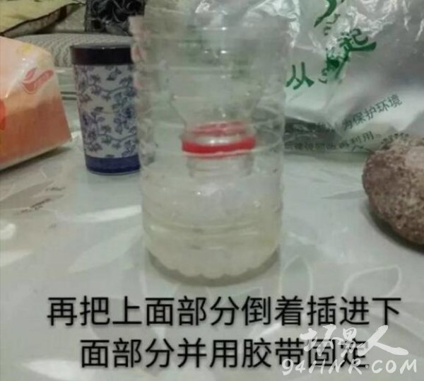 然后我们讲剪出来的瓶子的上半部倒着插入下半部中,再用胶带进行固定。这里要注意的一点就是,瓶口的位置一定要离诱饵的水面有一段距离,不然蟑螂就只会在瓶口那逗留啦。