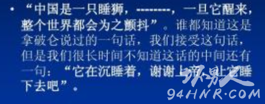 谁都知道这是拿破仑说过的一句话,我们接受这句话,是因为一个伟大的外国人对中国有如此崇高的评价,作为一个中国人,我们深感自豪。而我们也深信这只睡狮已经醒来,已经让世界感到它带来的颤抖,因为中国人民已经站起来了,已经当惊世界殊了。但是我们很长一段时间不知道这句话的中间还有一句:“它在沉睡着,谢谢上帝,让它睡下去吧”。
