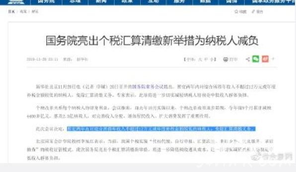 11月20日,国务院总理李克强主持召开国务院常务会议,会议强调,要合理有序建立个税年度汇算清缴制度,使专项附加扣除政策更好落实并不断完善,实现税制可持续。同时,为进一步减轻纳税人负担,两年内对综合所得年收入不超过12万元或年度补税金额较低的纳税人,免除汇算清缴义务!