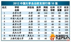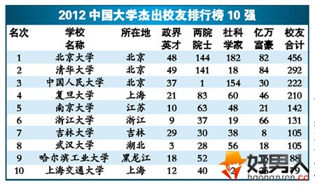 记者注意到,从各指标综合看,2012中国大学杰出校友排行榜总榜单仍是北京大学居首,其次是清华大学和中国人民大学。
