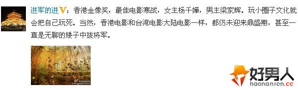 对于金像奖的颁奖结果,网友进军的进表示“玩小圈子文化就会把自己玩死。当然,香港电影和台湾电影大陆电影一样,都仍未迎来鼎盛期,甚至一直是无聊的矮子中拔将军。”
