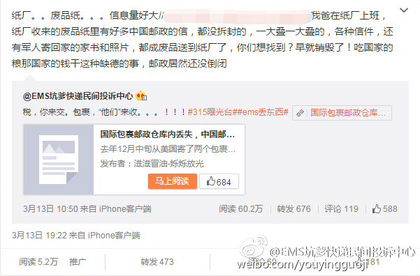 CCTV315那边今天会不会上中邮政EMS这个话题我不知道。
